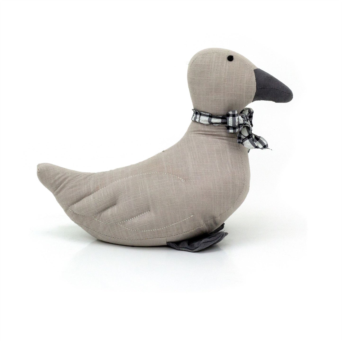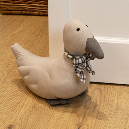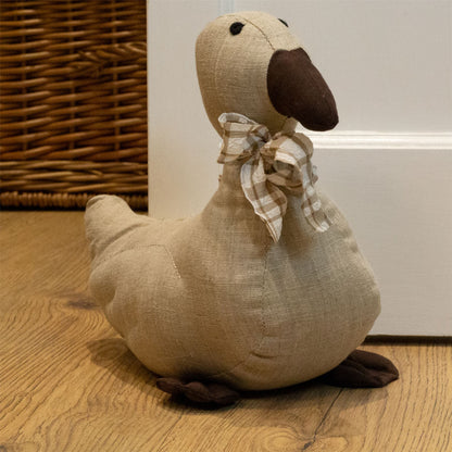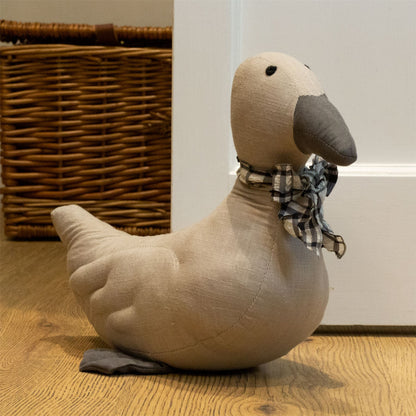 FUNCTIONAL AND STYLISH | Covered in a neutral-coloured fabric and adorned with a fetching gingham ribbon bow, our duck doorstop is always dressed to impress. Not only does she add character to any space, but she also securely holds doors without taking up too much space