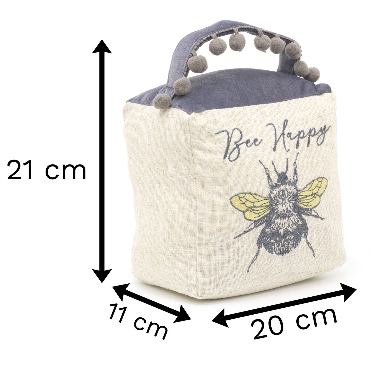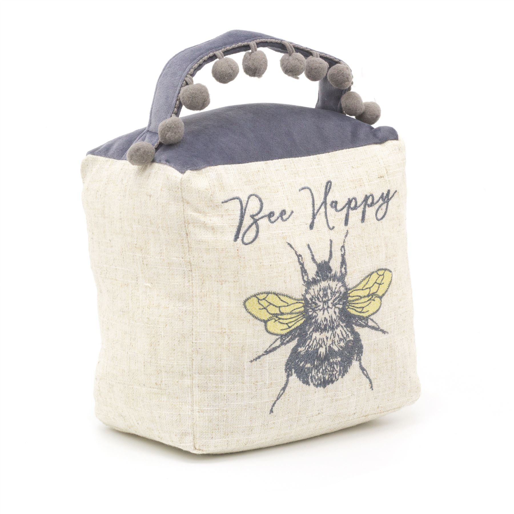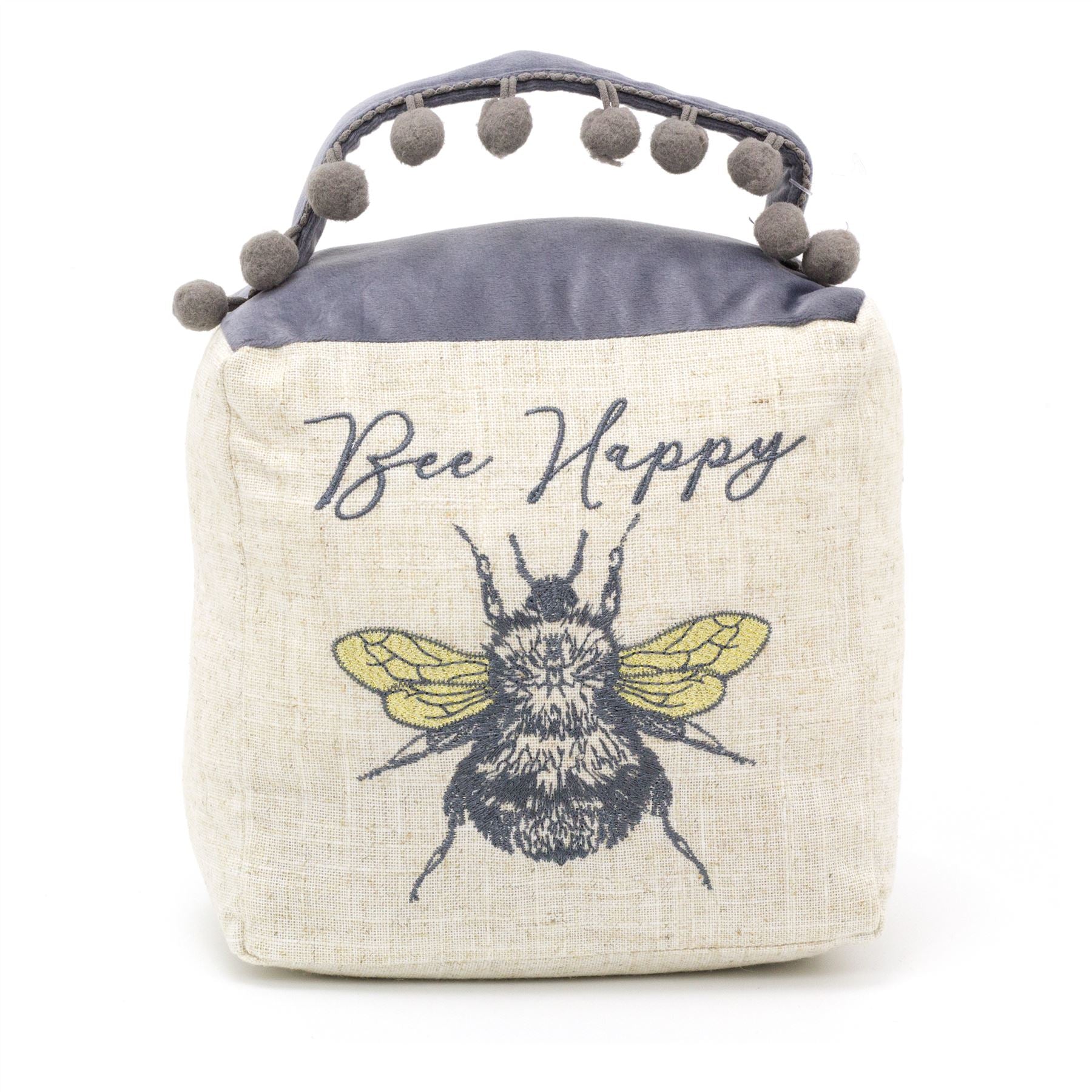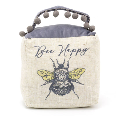 Bee Happy Cube Fabric Bee Doorstop | Honey Bee Pom Pom Doorstopper | Square Bee Door Stop With Handle