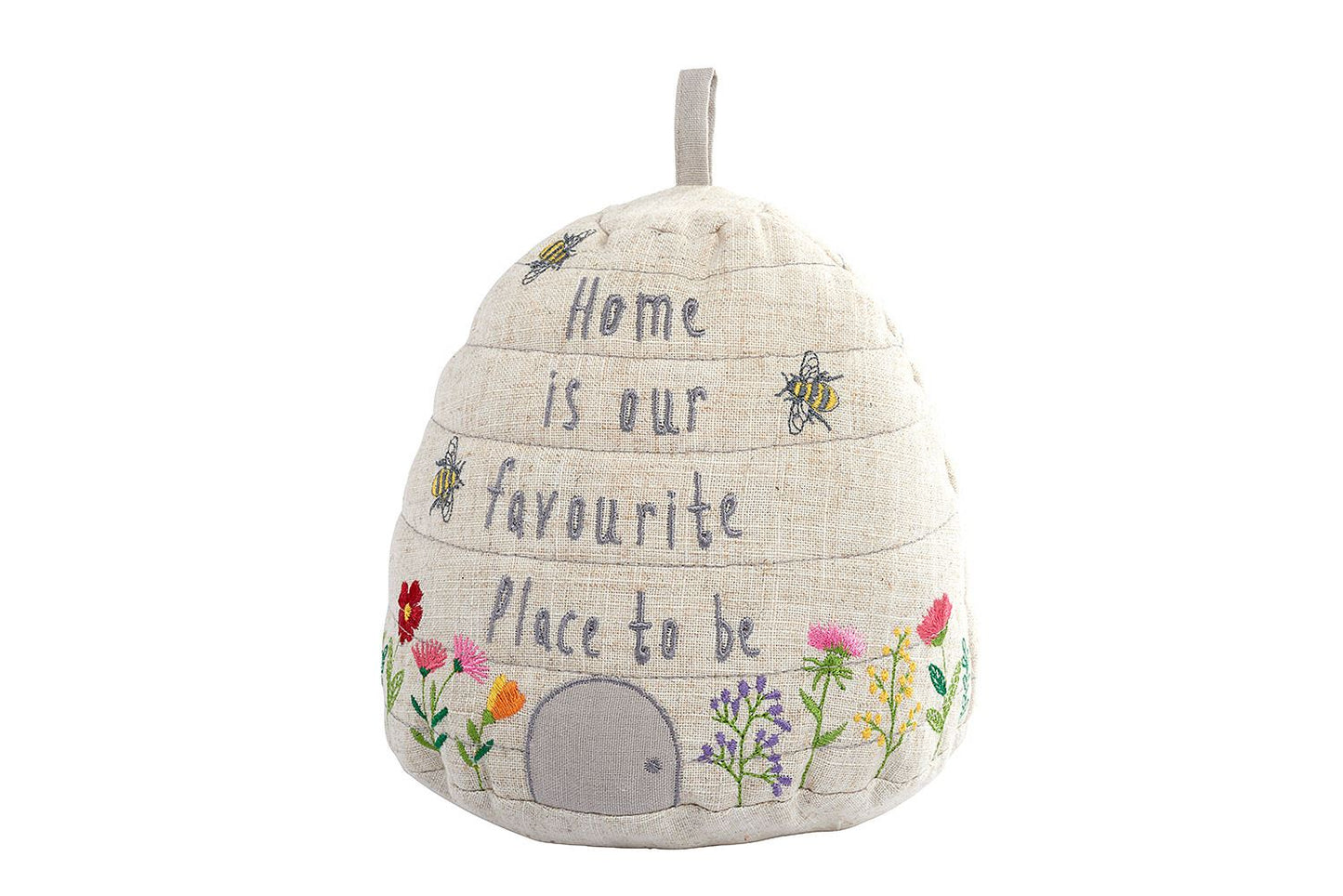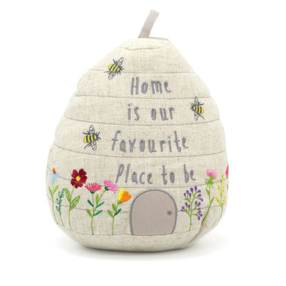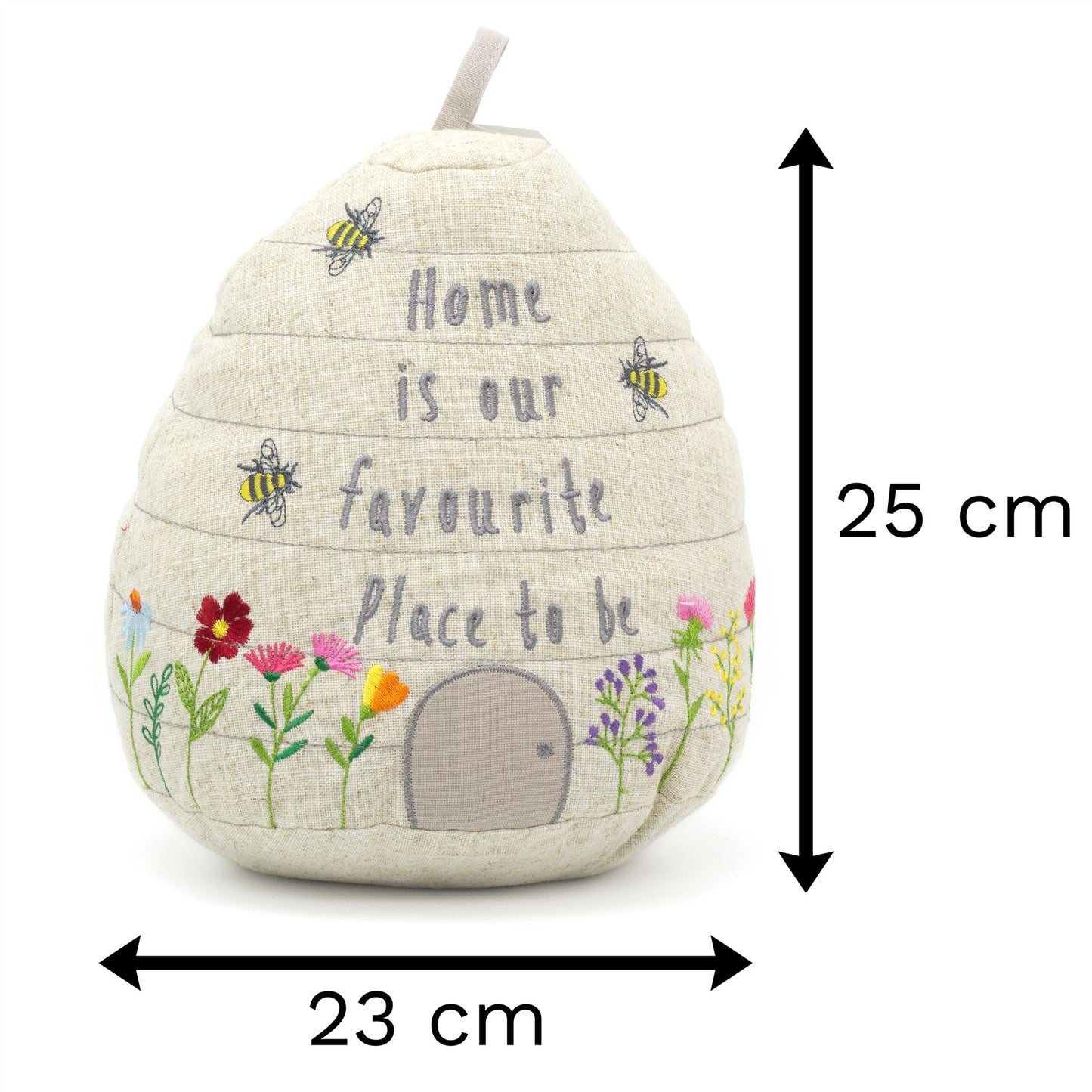 BEEHIVE DOOR STOP: This beautiful fabric hive doorstop features a lovely embroidered floral bee design. Reads 'Home Is Our Favourite Place To Be'. Fashionable and hard-wearing, perfect for any busy household