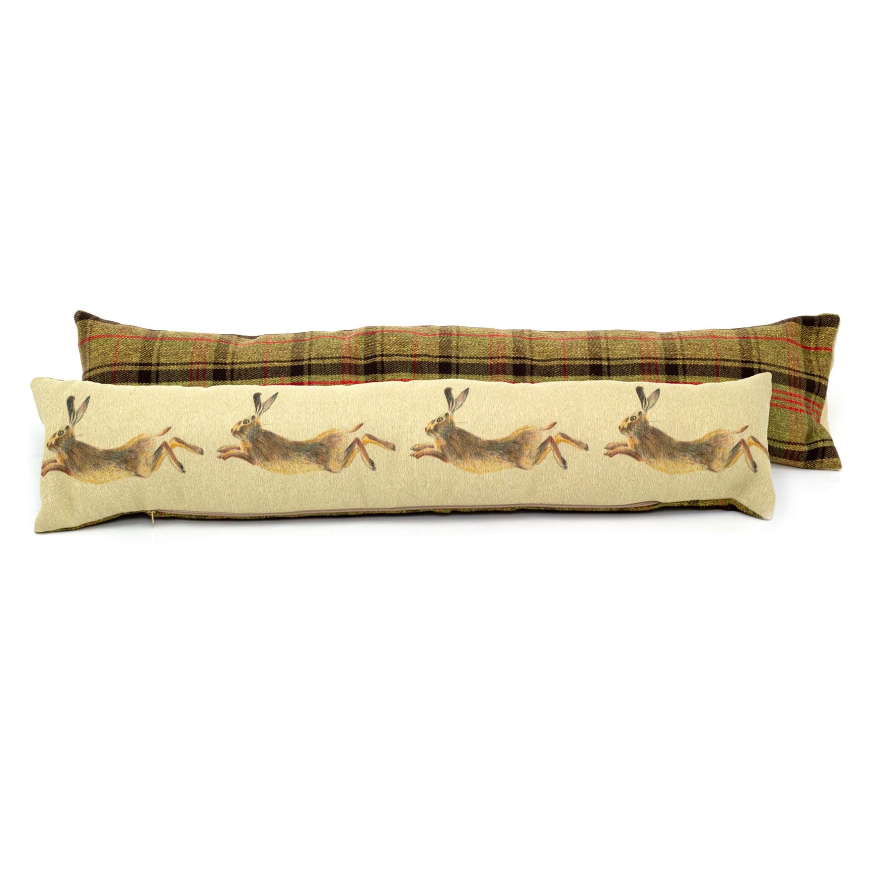 HARE DRAUGHT EXCLUDER | Our hunter hare draught excluder blends modern charm with classic countryside vibes. Featuring leaping hares on a linen background with a traditional tartan reverse, this soft yet durable draught excluder keeps your home cosy while adding character to your decor