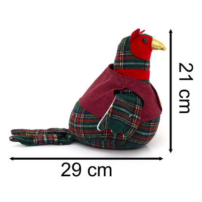 Add a bit of whimsy and warmth to your home this Christmas with this splendid doorstop. Dressed in a stylish green tartan and a dapper red waistcoat, this charming pheasant is more than just a decorative piece, his friendly face and playful design make him a delightful addition to any holiday gathering or a unique gift for family and friends