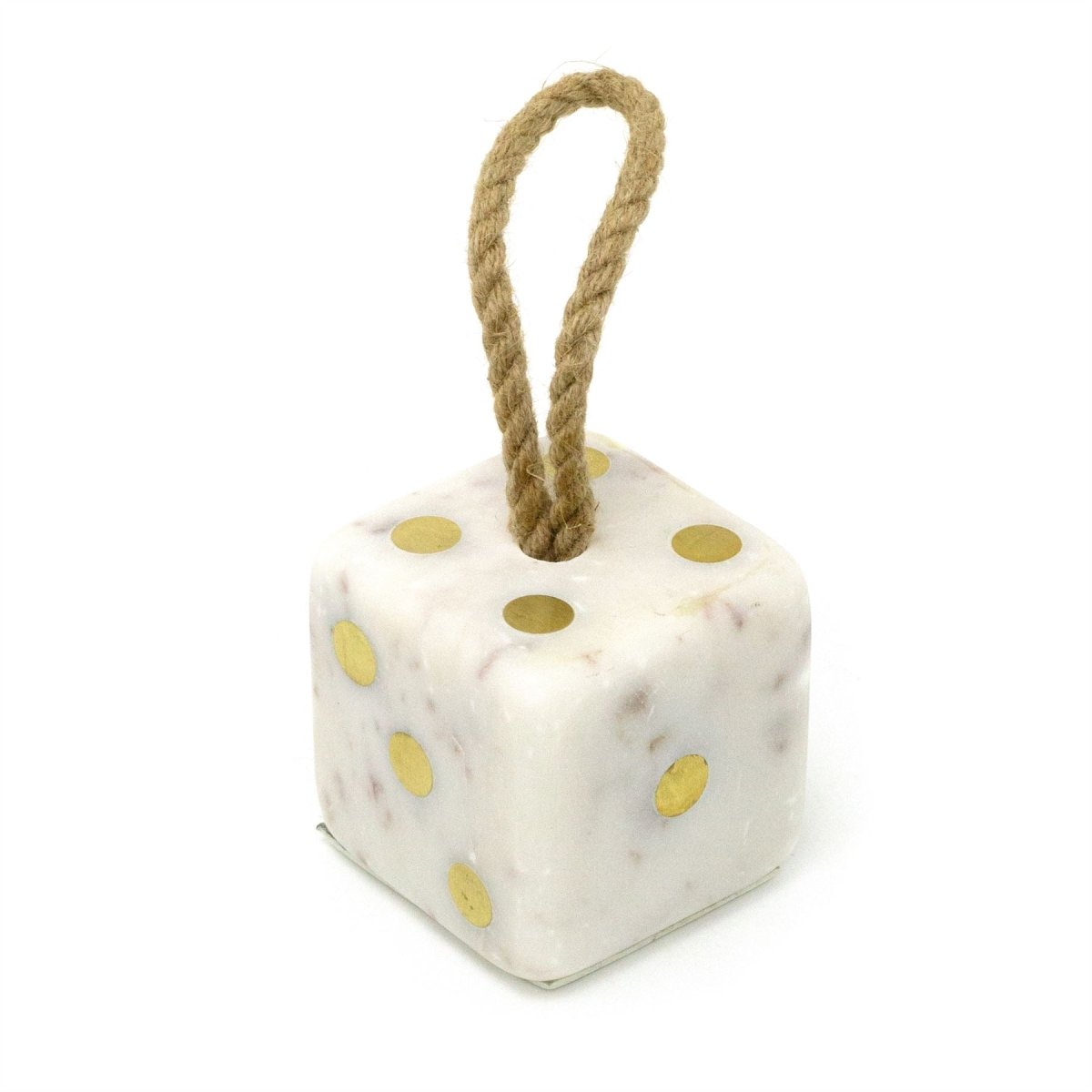 DICE DOORSTOP | This bold and stylish doorstop features a chunky dice shape, crafted from solid white marble with natural veining, making it a perfect fit for both modern and classic interiors