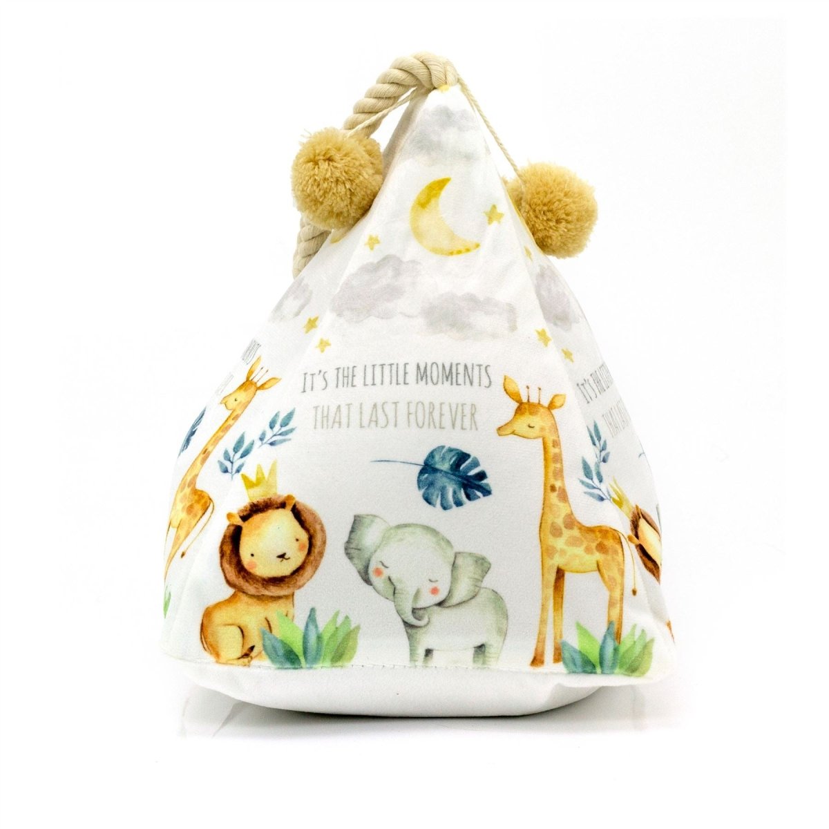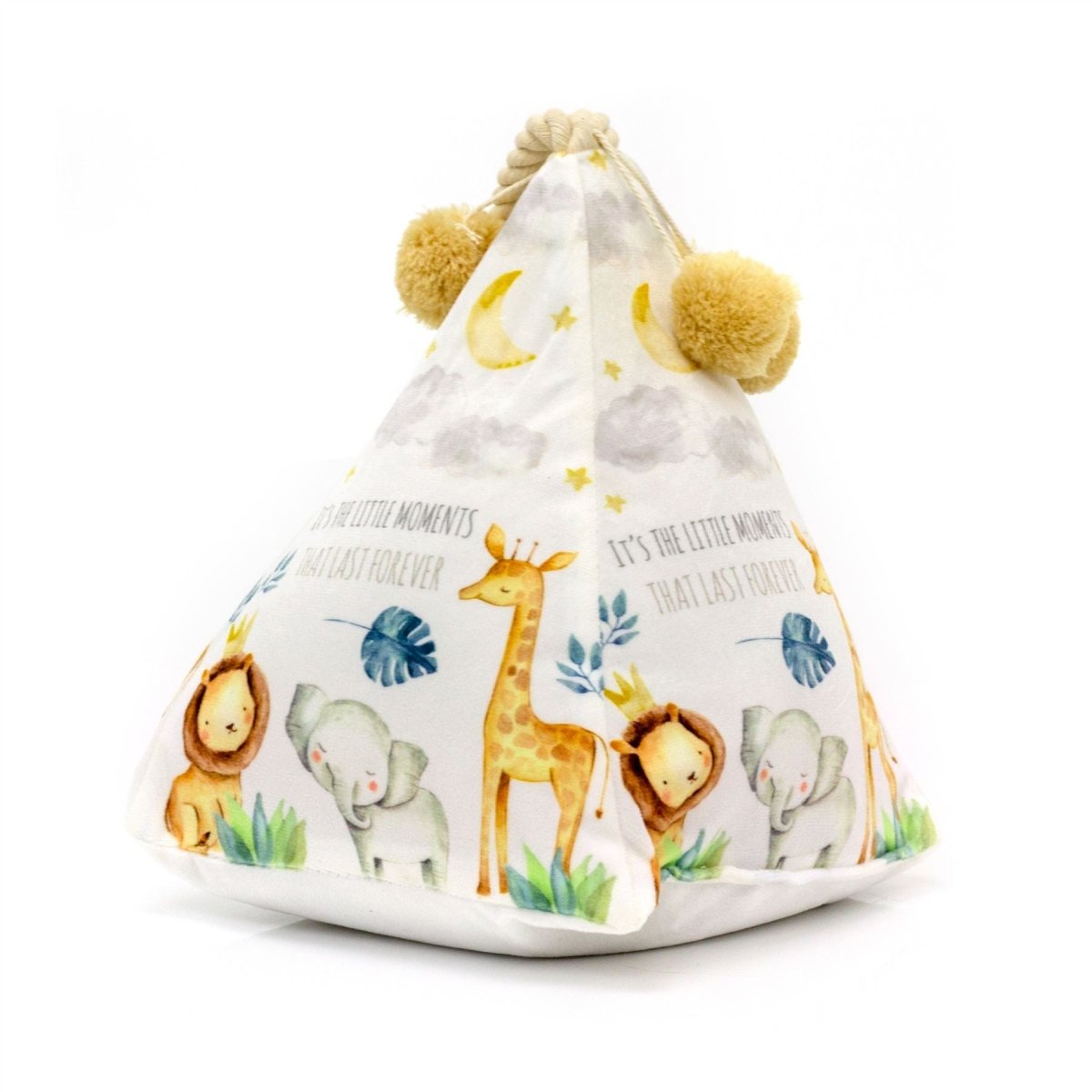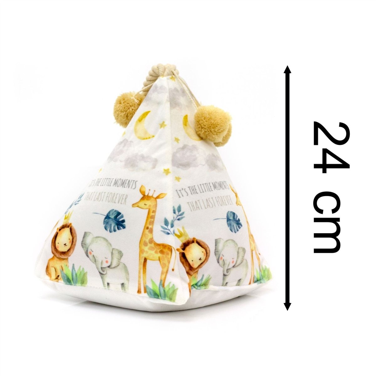 SAFARI JUNGLE NURSERY DECOR | Made from soft and durable fabric, it features cute baby animals and pompoms. Its pyramid shape provides a sturdy base that can keep any door securely propped open while adding a touch of fun to the decor